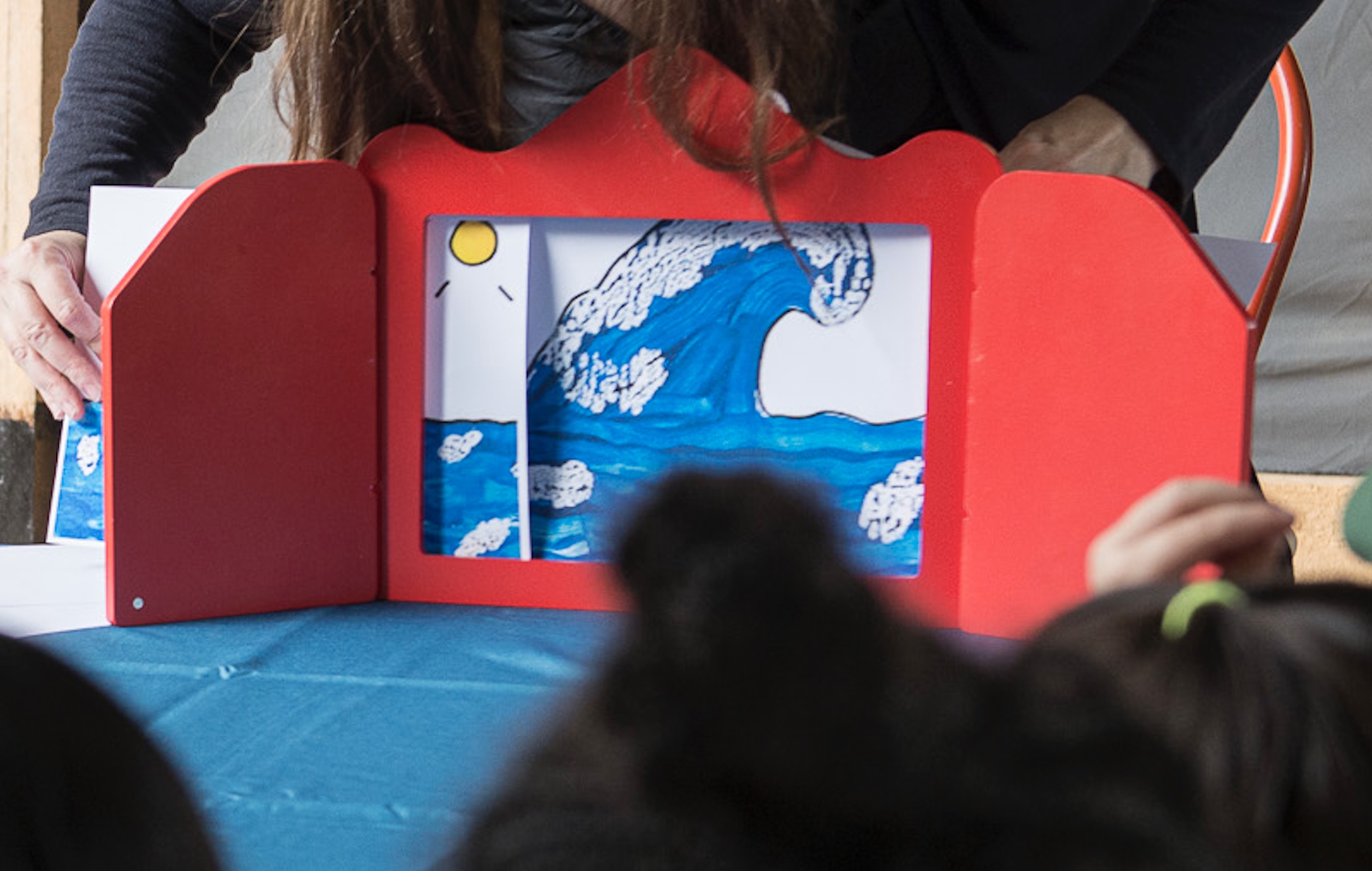 “Kamishibaï”就是这个故事,在日语中的字面意思是“戏剧纸游戏”。. 它是由插图板组成的, 阿米娜和娜塔莉, 上柴谷桑 (困扰) 协会的, 自从开始练习这门艺术 2003, 将滑入名为“butai”的小木城堡. 一旦剧院前面的三扇门打开, 给你, 听众·冰·潜水·和·故事中的内容,而插图则在您面前依次出现. 正文, 鲁奥诗, 允许动画讲故事, 创造一个神奇的集体时刻, 非常适合阅读和发展想象力.
